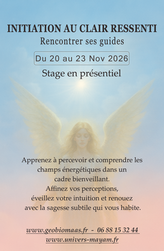 Le Stage d’Initiation au Clair Ressenti est une immersion complète, alliant théorie et pratique, conçue pour vous reconnecter à l’essentiel : votre sensibilité, votre conscience et votre énergie.
